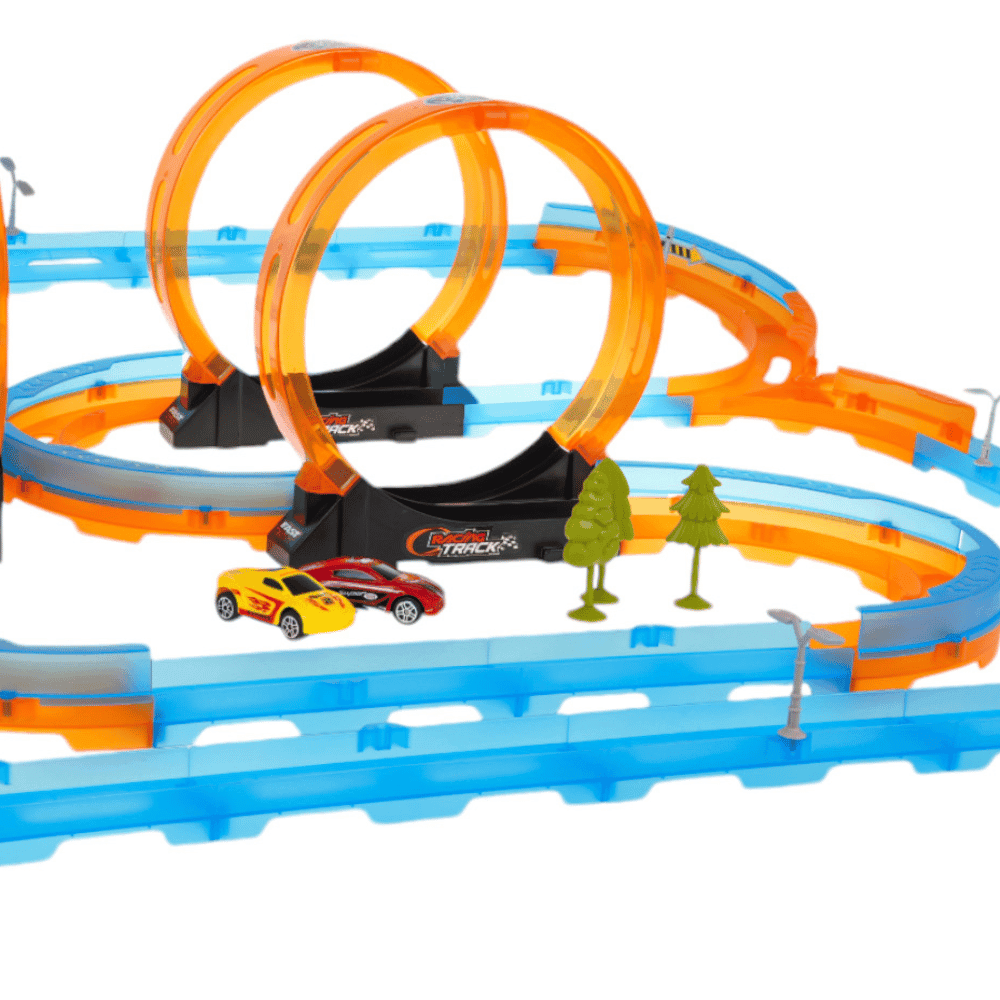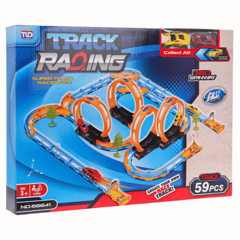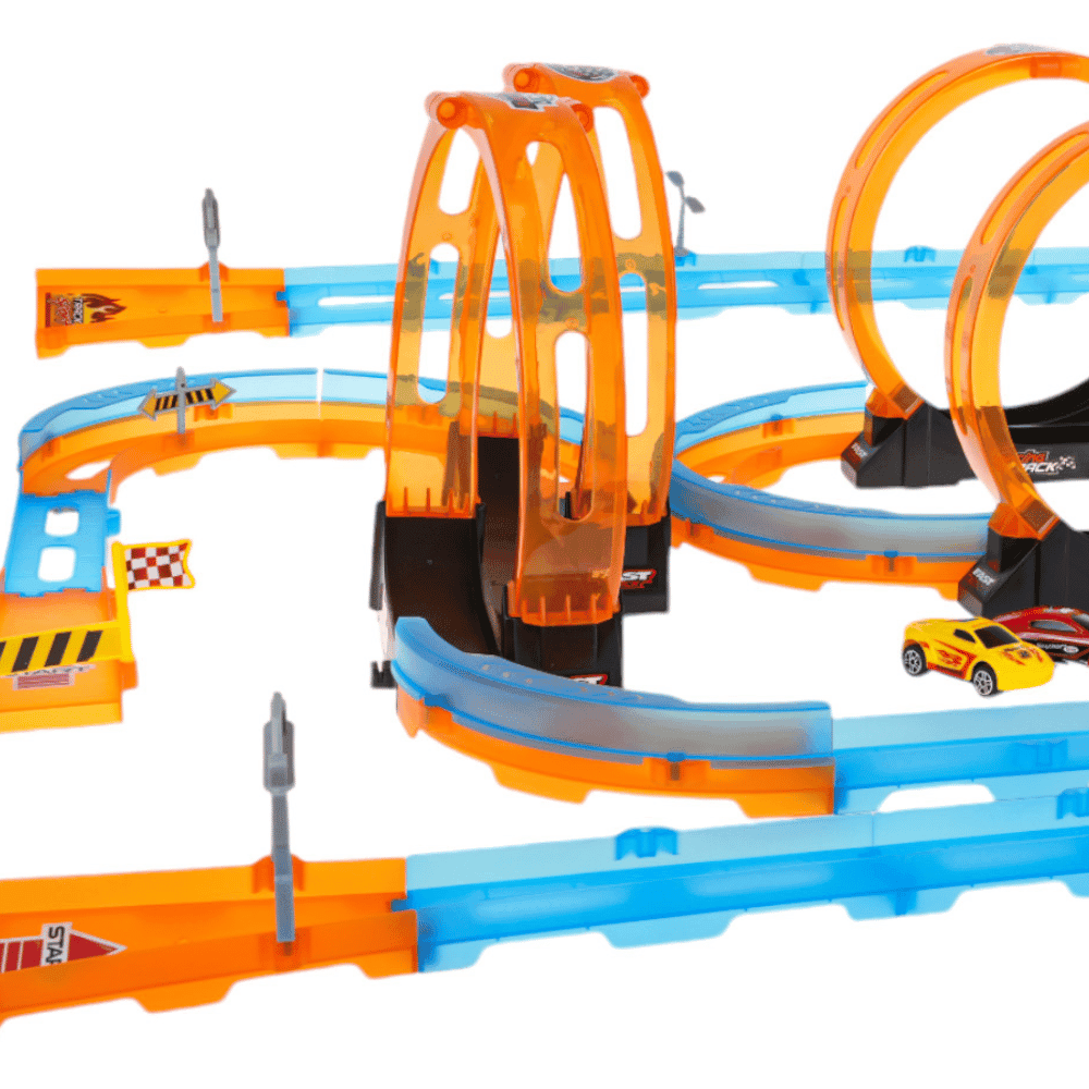 Podwójny tor wyścigowy z pętlami 360 stopni, dla dzieci od 3-go roku życia. Tor wykonano z najlepszej jakości plastiku w żywych kolorach. Na zestaw składa się 59 elementów do samodzielnego montażu. Tor posiada odcinki proste do rozpędzenia pojazdu, 4 pętlę 360 stopni i dwa pojazdy. Pojazdy napędzane są napędem pull back. Wystarczy delikatnie nacisnąć pojazd do tyłu, by przejechał tor z pełną mocą