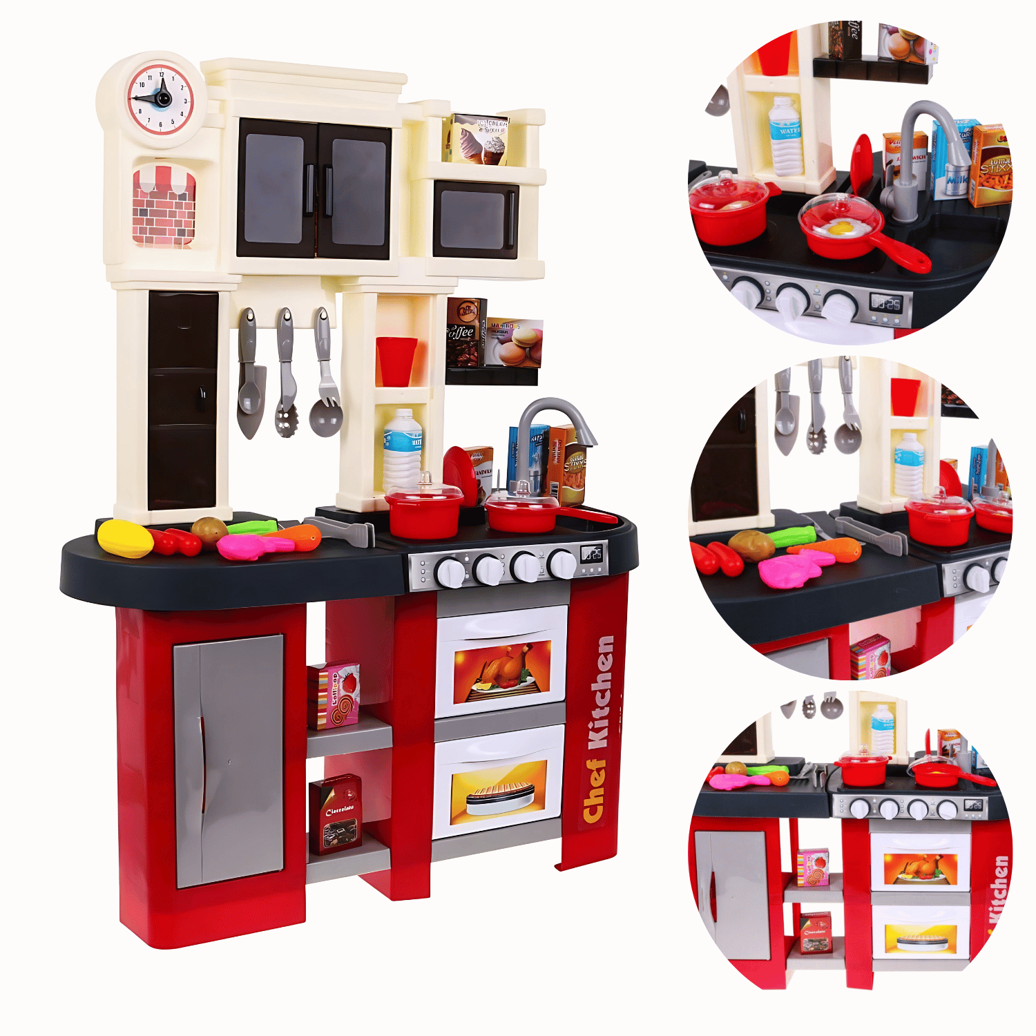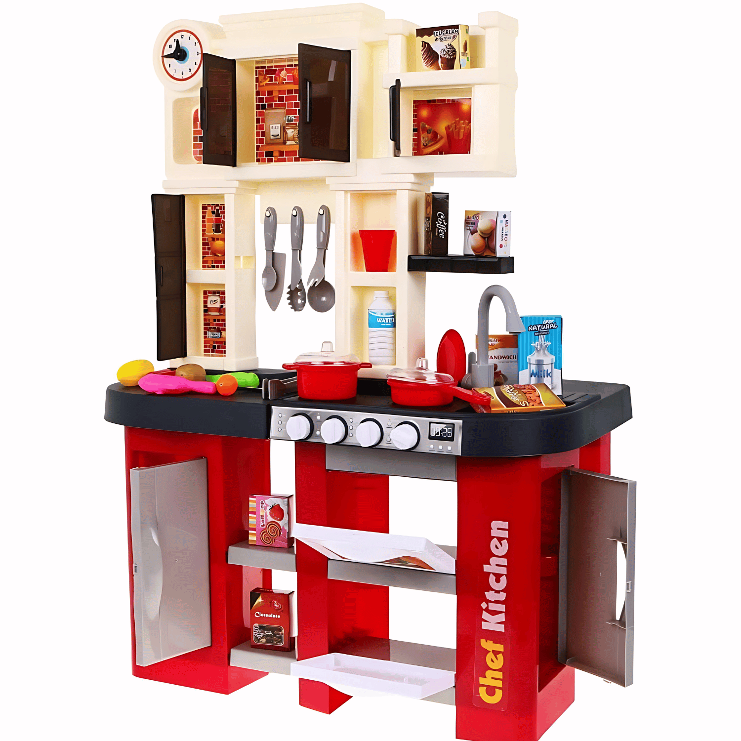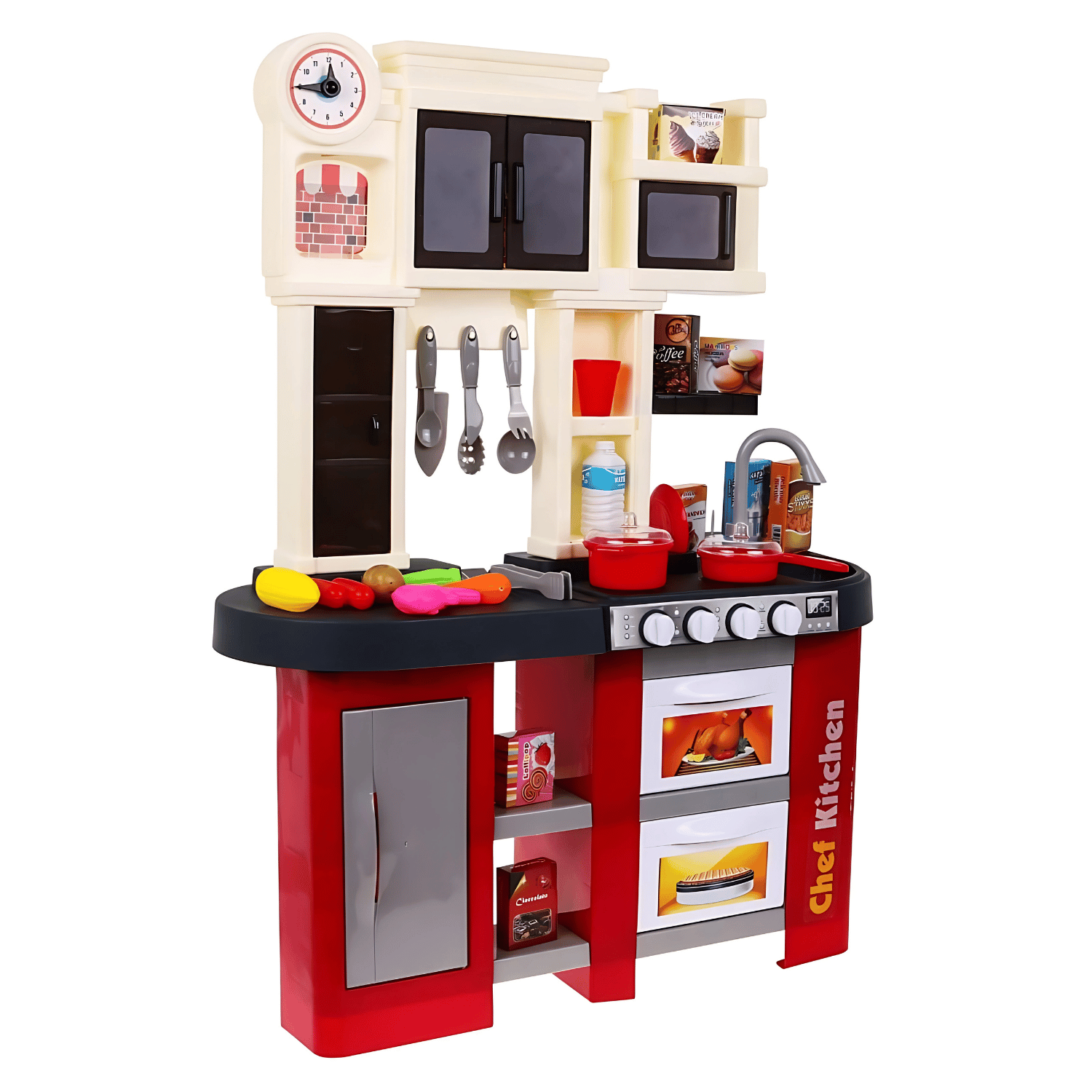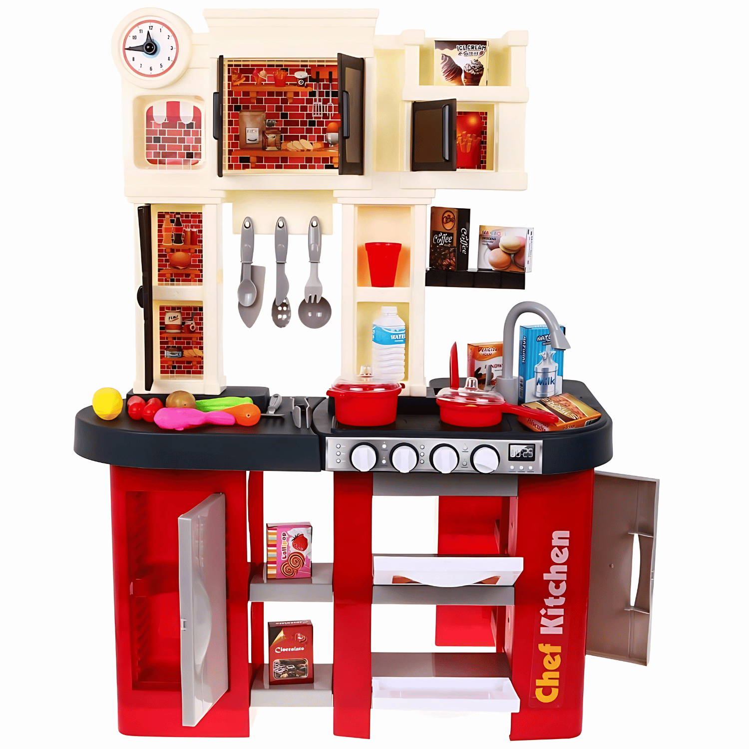 Wysokiej jakości, duża kuchnia interaktywna z prawdziwą bieżącą wodą z kranu, światłami i dźwiękami gotowania oraz smażenia. Zestaw z pewnością spodoba się każdemu małemu szefowi kuchni. Zabawka idealna zarówno dla chłopca jak i dziewczynki. Zabawka przeznaczona jest dla dzieci od 3 – go roku życia i posiada certyfikat CE. Zabawka zasilana jest bateriami typu 3 x AA (brak w zestawie). Opis funkcji kuchni: 1. Palniki po przekręceniu wydają odgłosy (gotowanie, smażenie). 2. Palniki podświetlają się przy gotowaniu. 3. Zegar z ruchomymi wskazówkami. 4. Kranik z prawdziwą wodą. 5. Możliwość otwierania piekarnika, szafeczek, lodówki Zestaw składa się z 58 elementów. | |