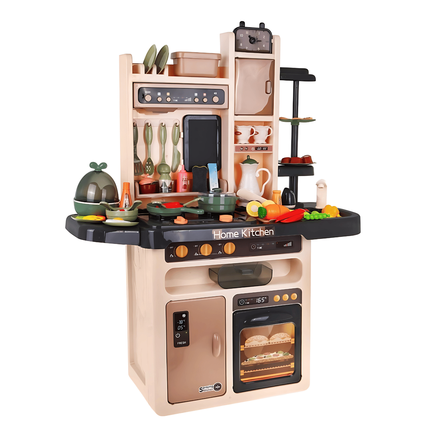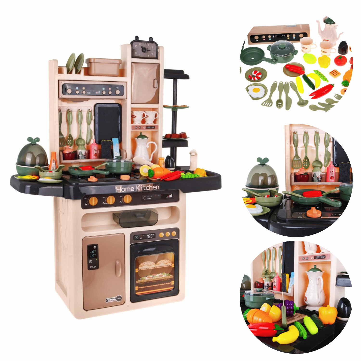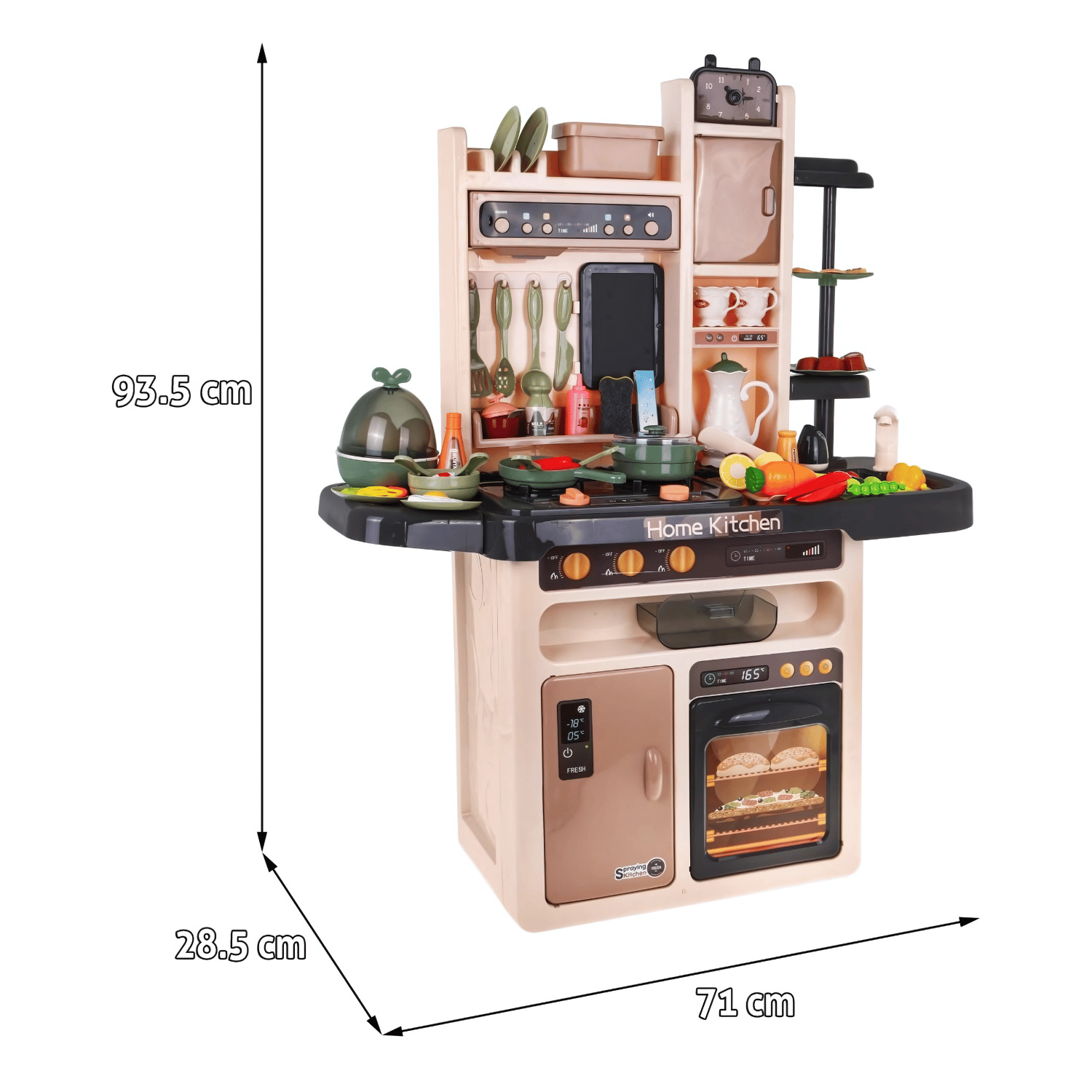 Rewelacyjna, bogato wyposażona, duża multifunkcyjna kuchnia. Kuchnia posiada zlew z kranem z którego leje się woda, podświetlane palniki z odgłosami gotowania i smażenia, jeden z palników posiada funkcję wytwarzania pary wodnej, ruchome pokrętła, okap z lampką i panelem muzycznym, otwierany piekarnik, otwieraną lodówkę, zegar, półeczki i liczne akcesoria kuchenne (65 elementów). W akcesoriach kuchennych znajduje się min. jajowar, który „gotuje” jajka, wydając przy tym dźwięki oraz tablica z kredą i gąbką. Zestaw przeznaczony jest dla dzieci od 3-go roku życia i zasilany jest bateriami typu 8 x AA, które nie są dołączone do zestawu. | |