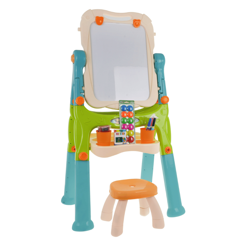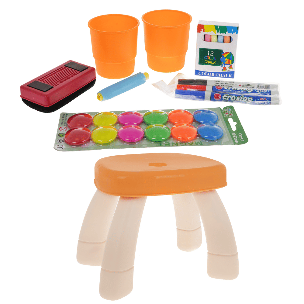 – taboret, – regulowana, obrotowa o 360 stopni tablica, – wymienne nóżki – dłuższe, krótsze, – półka na akcesoria, – śruby mocujące, – 2 kubki plastikowe, – 3 x pisak zmazywalny (marker), – 12 kolorowych kawałków kredy, – uchwyt na kredę, – 12 kolorowych magnesów (2 x róż, 2 x żółty, 2 x czerwony, 2 x niebieski, 2 x pomarańcz, 2 x zielony), – gąbka z magnesem, – 2 łapki do mocowania kartek. |